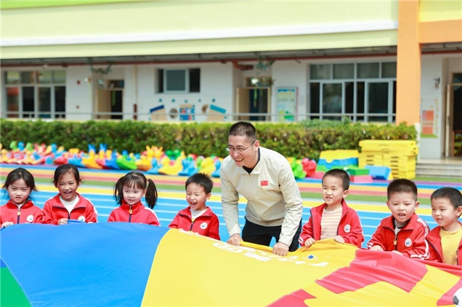 福建八马茶业总经理周灼能与幼儿园孩子们一起户外游戏
