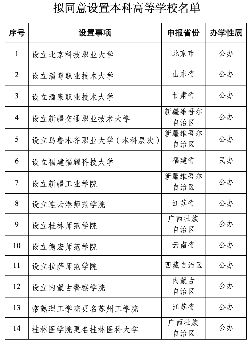 根据《中华人民共和国高等教育法》《普通高等学校设置暂行条例》《普通本科学校设置暂行规定》《本科层次职业学校设置标准(试行)》等有关规定以及第八届全国高等学校设置评议委员会考察评议结果,经教育部党组会议审议,拟同意设置北京科技职业大学等14所学校。