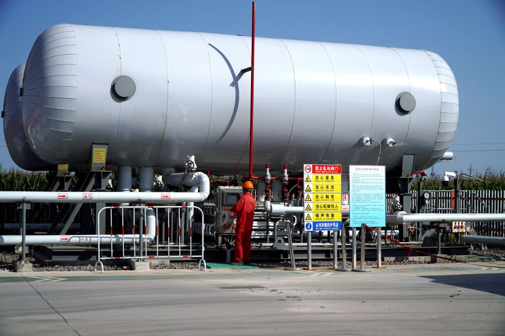 2022年9月18日,在位于山东省淄博市高青县的齐鲁石化—胜利油田百万吨级碳捕集、利用与封存项目10号注气站,一名工作人员在检查设备。新华社记者徐速绘 摄