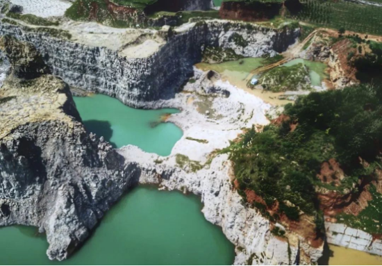 石头寨往西大约1公里处一处环境优美的“天池”,村民都叫它——白虎山天池。从远处看,它像一座再普通不过的小山岗的坑塘,一路走上去,才能看到它的“庐山真面目”。白虎山天池不是天然形成的湖泊,而是前几年附近村民挖到了3眼泉水,因泉眼常年向外喷涌,目前,天池南北3公里长,水面达600多亩,最深处40多米。站在“天池”上向下看,人造青岩绝壁,虽截面整齐但亦嶙峋突兀,峭壁耸翠,基岩裸体,谓为壮观;天池水色清澈,周围的岩砾、砂石被染成红褐黄绿、深浅不一的颜色,沟壑参差俏丽,峰群一字从南向北排列,在氤氲的水气中,闪烁着五光十色的光芒。