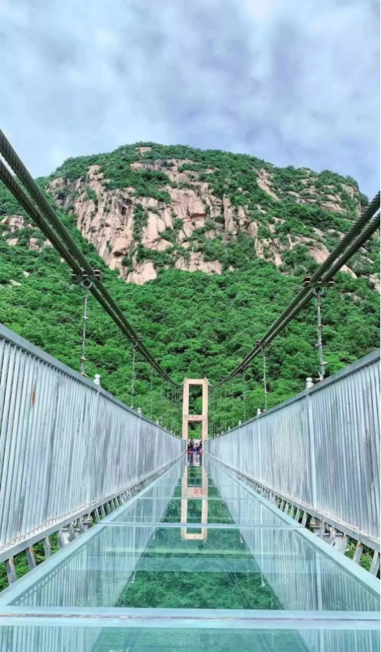 玻璃景观桥建于白虎山天池之上,总长166米、总高65米,走在桥上,脚下的天池景观一览无遗,令人产生“人在天上走、景在脚下游”的特殊体验。