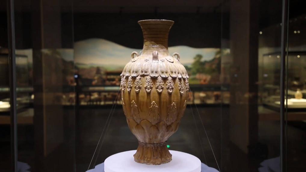 位于展馆古瓷厅的青釉莲花尊前人头攒动,这件“镇馆之宝”形体硕大,胎体厚重,釉色青中泛黄,口颈部有八道阴性弦纹,肩部围绕一周粗绳纹,腹中部有两圈大小不一的忍冬花纹。