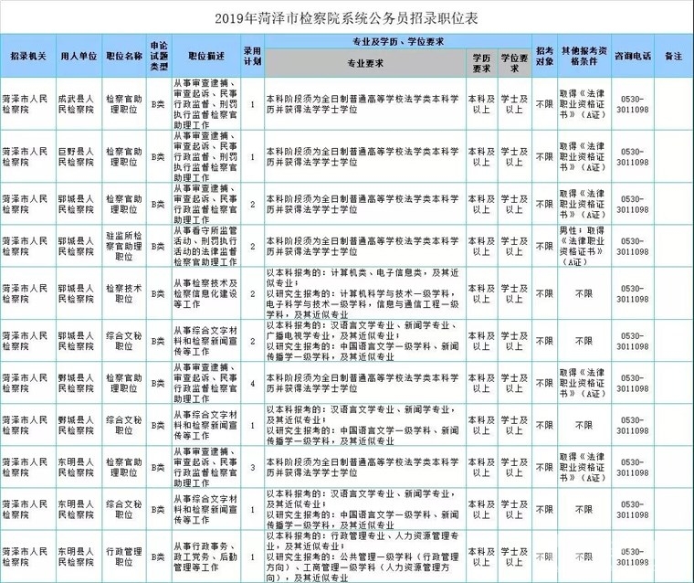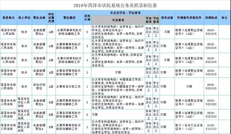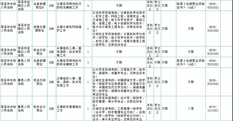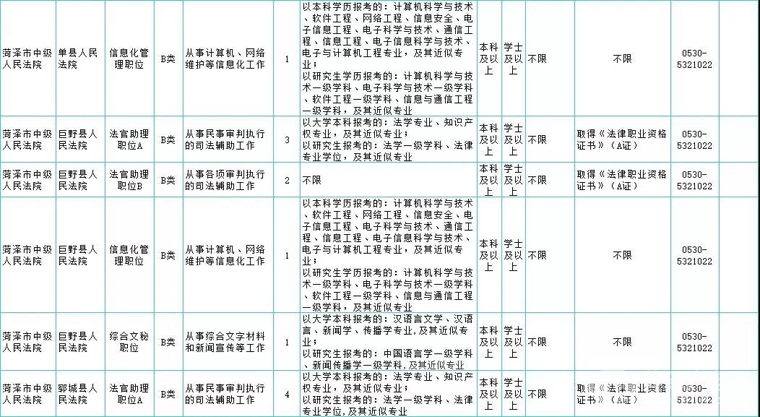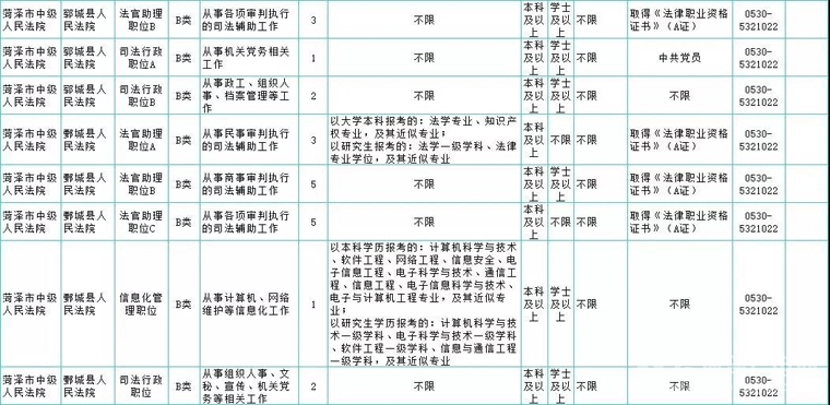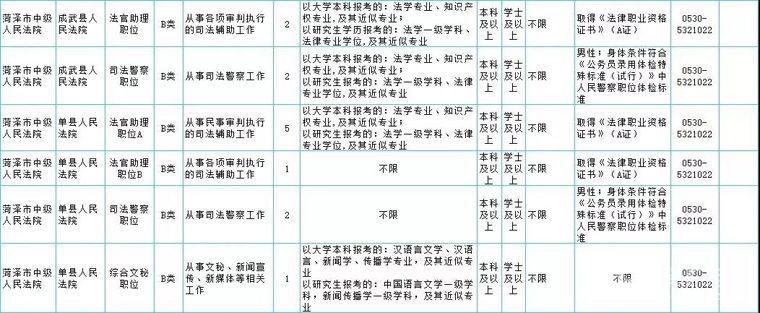 菏泽市中级人民法院(用人单位市中级人民法院机关): 0530-5321015