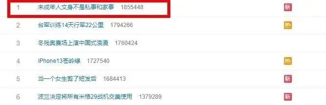 近年来,“文身”在社会流行度增加,并出现低龄化现象。近日,微博话题#未成年人文身不是私事和家事#更是冲上热搜榜第一,引发网友广泛关注。
