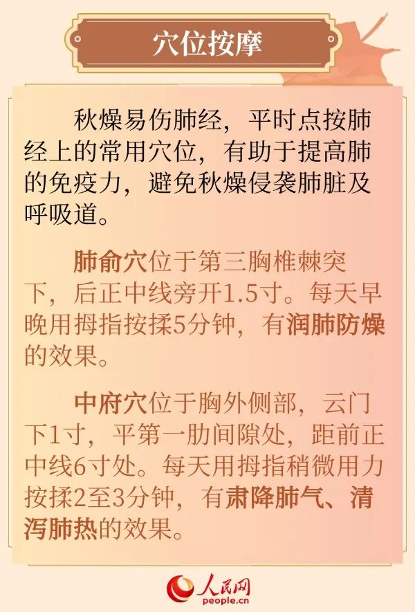[摘要] 秋分过后,随着气温和湿度下降、风速加大,人体容易感受外部的燥邪,燥邪又最易伤肺。
