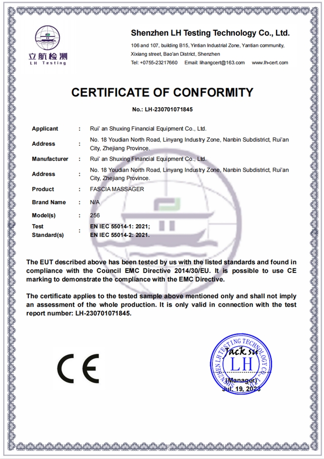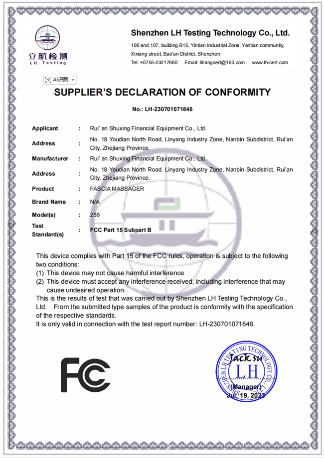 值得重点说明的是,鲸帝筋膜枪的外观设计获得国家外观设计专利(专利号:ZL 2020 3 0504704.9),同时具备CE-EMC证书和FCC证书,各项性能指标均符合国家相关标准,品质合规有保障,无任何安全隐患,全家老少都能放心使用。
