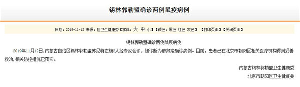 2019年11月12日,内蒙古锡林郭勒盟卫健委和北京市朝阳区卫健委联合发布信息称:内蒙古自治区锡林郭勒盟苏尼特左旗2人经专家会诊,被诊断为肺鼠疫确诊病例。一时间,“北京确认接诊鼠疫病例”这则消息在社交平台被刷屏,有关鼠疫的各种信息在网络上传播。