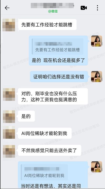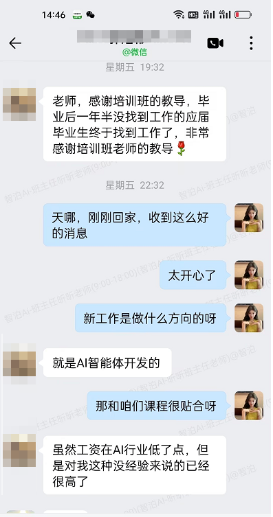 这位学员的求职之路,曾一度陷入低谷。毕业一年半的时间里,他辗转多家企业投递简历,却屡屡因缺乏核心技能、与行业需求脱节而碰壁,长期的求职无果让他陷入了深深的焦虑。看着身边同学陆续入职,他有时都会自嘲“差点去送外卖”,在职业选择的十字路口徘徊不前。在迷茫之际,他了解到智泊AI在大模型培训领域的专业口碑,抱着 “破釜沉舟” 的决心,加入了智泊AI的培训班的学习,开启了职业逆袭的全新征程。