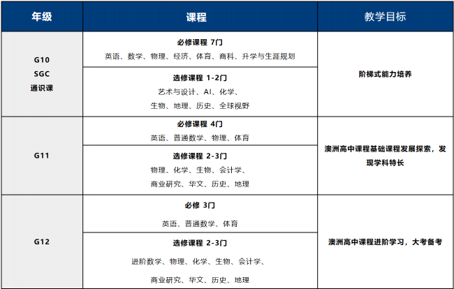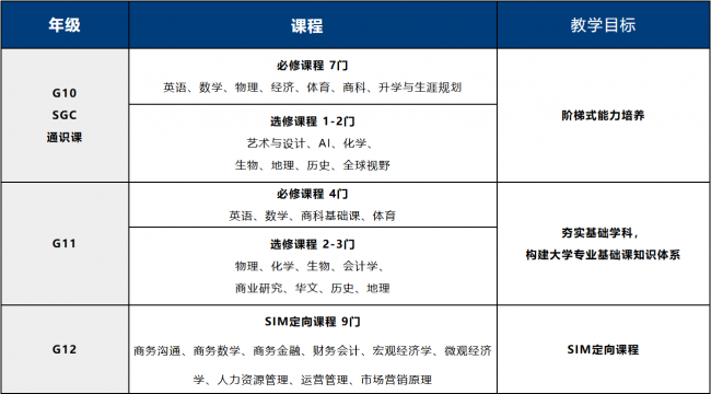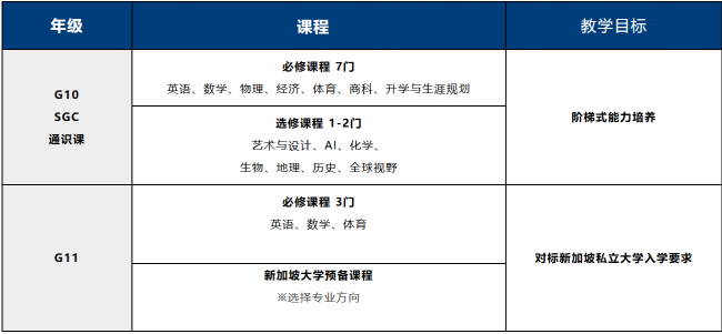 学生在G10年级以SGC通识课程为主要学习内容,进入G11年级后,学生可根据自己的学情、特长和未来大学方向进行课程选择“2+2新加坡中本贯通课程”,锁定世界前200大学、“3+3 新加坡SIM定向课程”,定向升学新加坡第一梯队私立大学或 “3+3新加坡名校直通课程” ,冲刺世界前50大学。