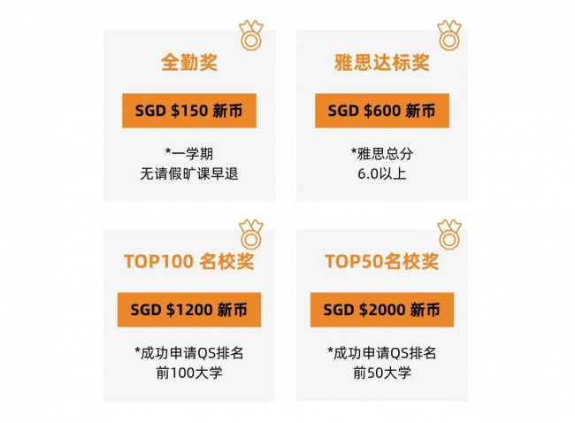 为激励优秀学子,学校设置了名校升学奖、雅思达标奖、全勤奖等丰厚的奖学金奖项。详情请咨询学校升学规划顾问。