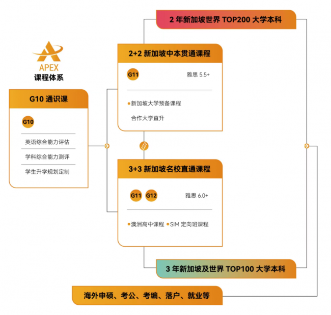 立足新加坡,面向世界。SGC成才新加坡融合高中引新加坡原版课程体制,学校的APEX课程体系以“学术通识课程”、“澳洲高中课程”、“SIM定向课程”、“新加坡大学预备课程”为核心课程依据中国学生的实际情况,提供2年制和3年制的学制升学路径。